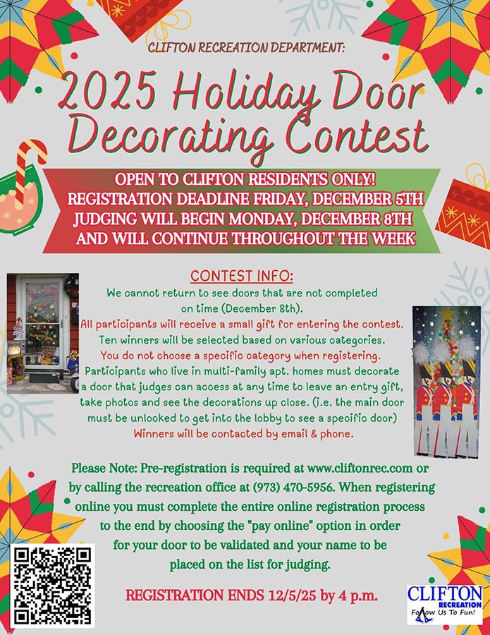 Register online at www.cliftonrec.com, by calling the office at (973) 470-5956, or in person at the Recreation Office -City Hall, 900 Clifton Ave. 2nd Floor. Please Note: If registering online, you must complete the entire online registration process to the end in order for your door to be validated and your name to be placed on the list for judging. Online registration ends 12/5/25 by the end of the business day. The contest is open to Clifton residents only! Tell your family and friends about this fun and friendly contest. Show us what the holidays mean to you!