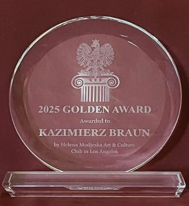 10 września 2025, Los Angeles —— W marcu 2025 r. na podstawie nominacji od Prezesa Mai Trochimczyk, Zarząd Klubu Kultury im. Heleny Modrzejewskiej przyznał Panu Kazimierzowi Braunowi swoją najnowszą nagrodę Golden Award (Złota Nagroda) za całokształt osiągnięć w dziedzinie teatru, jako dramaturg i reżyser, autor 23 sztuk w j. polskim i angielskim. Nagroda, przyznana po raz drugi w historii Klubu (pierwszymi laureatami byli Panowie Jacek Bromski i Jerzy Antczak w marcu 2024 r.), to statuetka i honorowy dyplom. Prezentacji nagrody dokonano w formacie Zoom w maju 2025 r., samą Nagrodę i Dyplom wysłano pocztą, natomiast w rozmowie z laureatem wzięli udział aktorzy Agata Pilitowska z Polskiego Teatru w Toronto oraz Marek Probosz z Los Angeles a prowadziła ja dr Maja Trochimczyk, prezes Klubu. https://youtu.be/75e0aMXUEJg (wywiad po polsku).