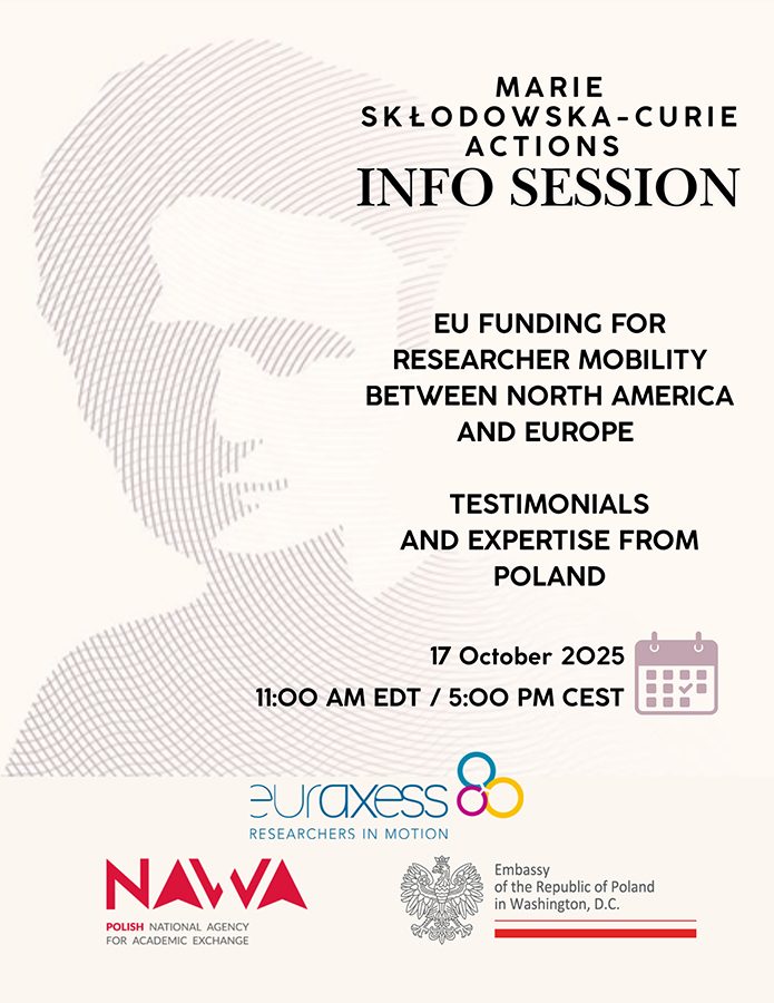 The Embassy of the Republic of Poland in Washington, D.C. cordially invite you to a Virtual Info Session on Marie Skłodowska-Curie Actions – Postdoctoral Fellowships (MSCA-PF) co-hosted with EURAXESS North America and the Polish Agency for Academic Exchange (NAWA)!